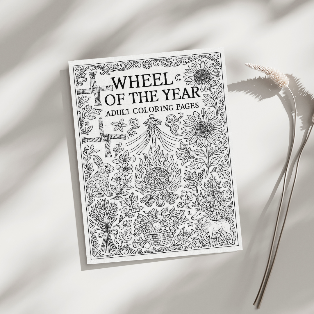 This printable Wheel of the Year Adult Coloring Book includes 8 sabbat-themed coloring pages, each designed with intricate line art and symbolism to support seasonal reflection and creative self-care. Whether you’re winding down at the altar or sipping tea in your cozy corner, these pagan coloring pages are a peaceful way to honor each turn of the wheel. Perfect for personal ritual, meditation, or quiet witchy downtime.