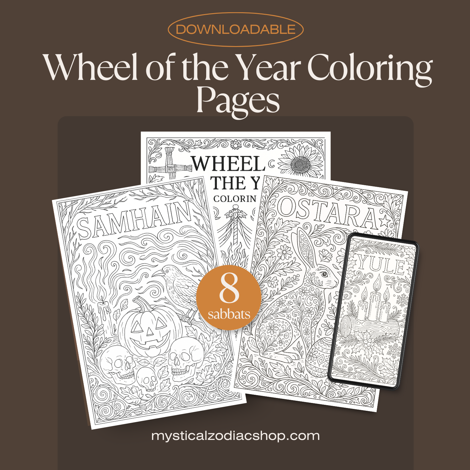 Each sabbat page includes detailed symbolic artwork and clean line work for use with markers, colored pencils, or digital tools. Pages are delivered in high-resolution 8.5x11" PDF format, ideal for printing at home.
